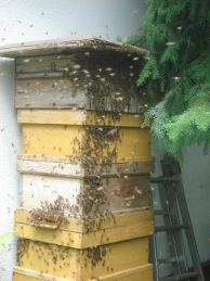 Er beobachtet die Bienentraube in luftiger Höhe vom Boden aus - ein sehr schöner und großer Schwarm. Umso ärgerlicher, dass man ihn nicht erreichen kann. Also stellt der Imker auf unserer Terrasse einen leeren Beutenturm auf, in der Hoffnung, dass ihn die Spurbienen, die die Gegend nach einer neuen Behausung absuchen müssen, begutachten und für gut befinden.