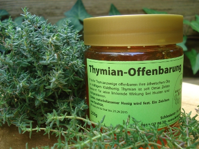 Wir haben deshalb unserem kräftigen, flüssigen Waldhonig frische Thymianzweige aus dem