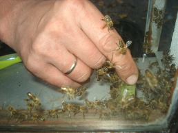 Irgendwie wollen aber nicht alle mit. Also hat er eine Königin geholt, die er ihnen vor die Nase hält, damit sie sich dann an dem Käfig sammeln. Er sitzt da seelenruhig in der Hocke, umschwärmt von seinen Mädels, die ihm unter anderem auch in die Haare fliegen, aus einer Kurzhaarfrisur aber auch leicht wieder entkommen können.